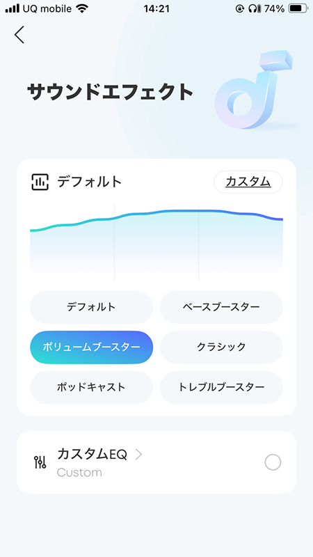 Soundcore AeroClip はデフォルトのままでも高音質ですが、「ボリュームブースター」に変更すると、小音量でもボーカルが聴こえやすくなり、音場が豊かに感じられるようになるんです。