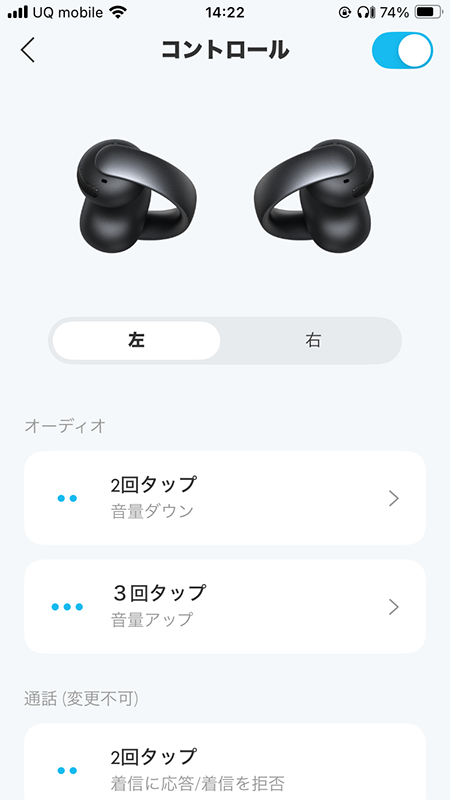 Soundcore AeroClip は、イヤホンを指でトントンと軽く叩く(タップする)ことで操作する設定になります。