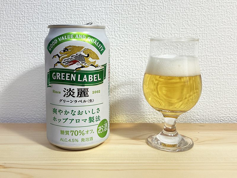 キリン淡麗グリーンラベル 缶のデザインと注いだようす